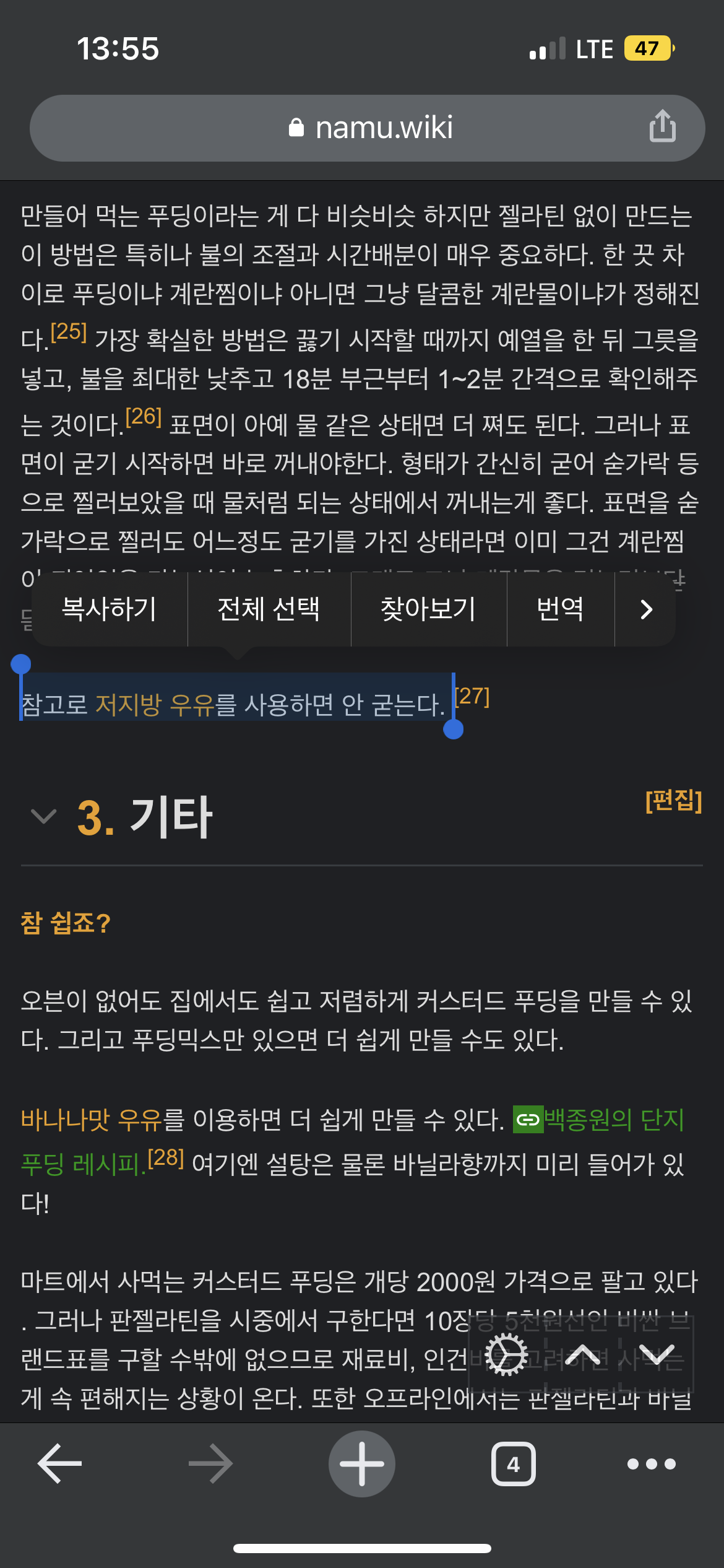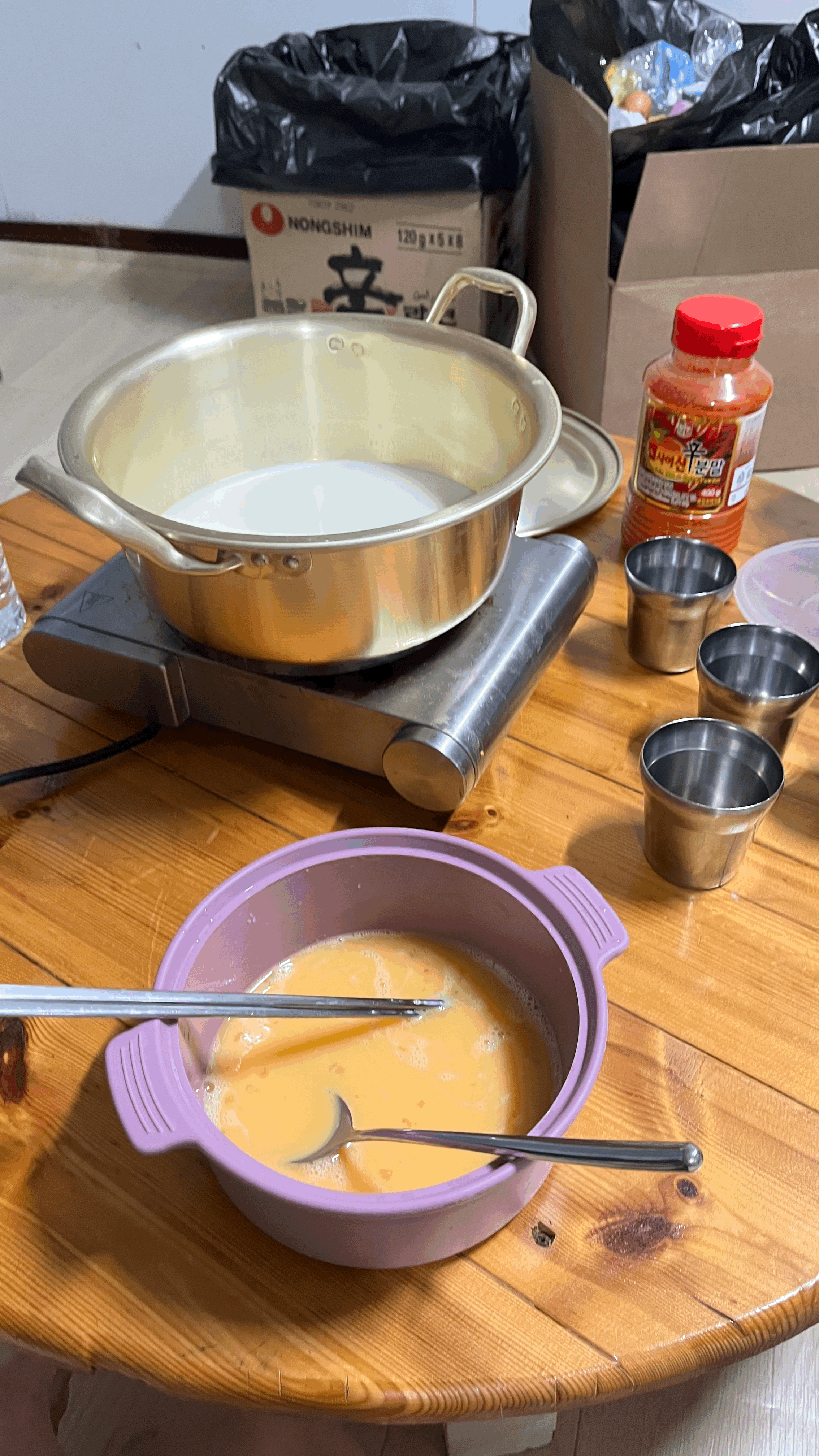 근데 마침 유튜브 보고 있던게 집에서 커스터드푸딩 만들기였고 인터넷도 안 되겠다 이거나 해보자 해서 다른 통신병 1명을 꼬셔서 바로 진행했다. 돌아다니며 계란(식당), 컵(식당), 호일(무료나눔), 설탕(무료 나눔), 우유(보급), 인덕션(무선반장님 꺼) 등 재료를 챙겼다. 레시피대로 계란과 우유를 섞어 중탕한 뒤 호일을 씌우고 냉장고에 넣었다. 한숨 자고 일어나니 다른 통신병이 설탕으로 카라멜을 만들고 있었다. 푸딩을 꺼내 카라멜을 넣고 다시 냉장보관을 했다. 저녁을 먹고 뜯었는데 2가지 문제가 있었다. 첫 번째는 계란 비린내가 너무 심했다. 아마 체에 안 거른 것과 신선함의 문제였던 것 같다. 두 번째는 일부는 푸딩이 아니라 덜 익은 계란찜이 되었다. 원래 오븐이 있어야 하는데 중탕해서 그런 거 같다. 근데 잘 만들어진 것들은 의외로 먹을만했다.